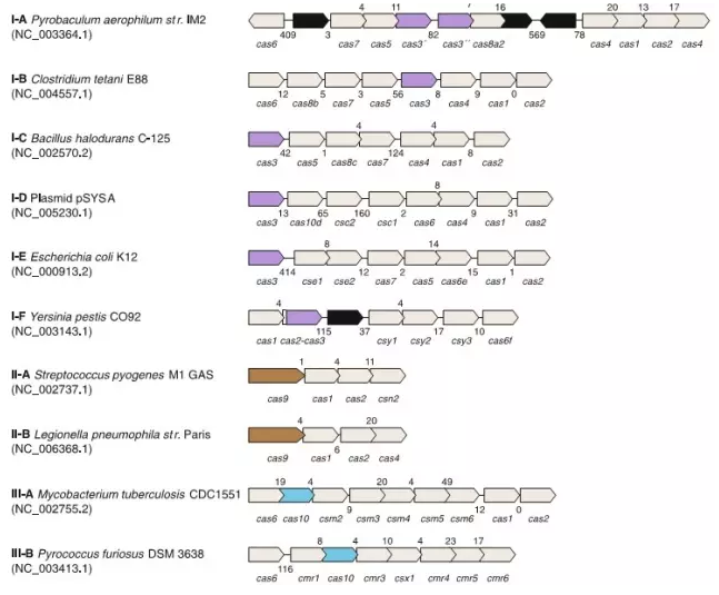 I 型CRISPR的標(biāo)簽基因是Cas3(紫色)。在不同的物種中,又將I 型細(xì)分為6個(gè)亞型(I-A-E),圖3。