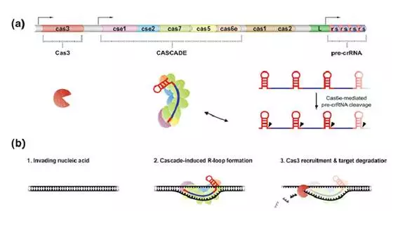 在表達(dá)階段(圖4. a),I 型會(huì)產(chǎn)生三個(gè)部分:Cas3,Cascade(Cse1, Cse2,Cas7, Cas5和Cas6e的復(fù)合物)和pre-crRNA。Pre-crRNA通過Cascade中的Cas6e來剪切加工獲得成熟的crRNA,并和Cascade繼續(xù)形成復(fù)合物狀態(tài)。