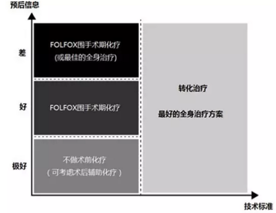 也許是由于循證醫(yī)學(xué)證據(jù)的缺乏,既往的ESMO指南一直沒有推薦靶向藥物用于初始可切除mCRC的新輔助治療,直到2015/2016年度,ESMO指南在初始可切除mCRC圍手術(shù)期治療模式的選擇上,版指南做了比較大的更改,明確提出要從"手術(shù)技術(shù)標準"和"腫瘤學(xué)預(yù)后因素"兩個維度進行考量(圖-1)。
