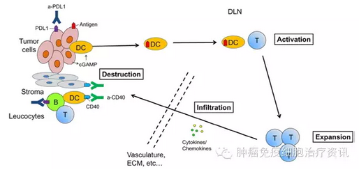 與一旦激活就會抑制免疫反應的PD-1和CTL-A4相比,以CD40/CD40配體(CD40L)為代表的可促進免疫應答的不同類別的免疫檢查點通路。CD40表達于B細胞,單核細胞和樹突狀細胞(DC)。CD40L主要表達于活化的T細胞和血小板。通過CD40激活抗原遞呈細胞信號并誘導共刺激和MHC分子的表達,從而加強抗原遞呈作用和T細胞致敏。模擬CD40L與CD40結合的抗體已被開發(fā),在體外和體內都可以激活免疫反應;此外,這類抗體已進入臨床試驗并顯示出了充滿前景的結果。有趣的是,盡管原始機制表明T細胞致敏在CD40活化之后,后來的研究顯示T細胞可能是非必需的,至少在某些腫瘤模型中是這樣。具體地說,在小鼠胰腺導管腺癌模型中,通過抗CD40誘導腫瘤消退依賴于巨噬細胞,而不是T細胞。抗CD40激活巨噬細胞,然后轉移至腫瘤組織引發(fā)腫瘤基質的耗竭來導致腫瘤的消退。有觀點認為,不僅在腫瘤模型中,在其他疾病模型中基質細胞對CD40激動劑療效發(fā)揮重要的作用。的確,在Bouchlaka等最近研究中發(fā)現(xiàn),對老年小鼠使用CD40激動劑聯(lián)合IL-2可誘發(fā)細胞因子風暴并致死。后續(xù)研究顯示,CD40誘導內臟脂肪組織中的巨噬細胞活化。這些活化的巨噬細胞產(chǎn)生了高水平的IFN,并導致了細胞因子風暴。為何只是老年小鼠會致命的一種可能的解釋就是老年小鼠器官內比年輕小鼠積蓄更多的脂肪。由于很多癌癥的發(fā)病率老年群體會更高,在CD40應用于不同癌癥患者時,應考慮到這個不利因素的影響。關于CD40/CD40L的報道是一個有趣的案例,這表明有些時候TME是免疫治療的主要目標,而不是腫瘤細胞。