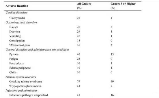 最常見的不良反應(發(fā)生率大于20%)包括低丙種球蛋白血癥,感染不明病原體,發(fā)熱,食欲降低,頭痛,腦病,出血,低血壓,心動過速,惡心,腹瀉,嘔吐,缺氧,疲勞,急性腎損傷和譫妄。