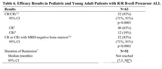 1 CR / CRi是根據(jù)所有接受KYMRIAH并完成至少3個月隨訪的患者計算的,或在數(shù)據(jù)截止前較早停藥。要求緩解狀態(tài)維持至少28天,無臨床證據(jù)復發(fā)。