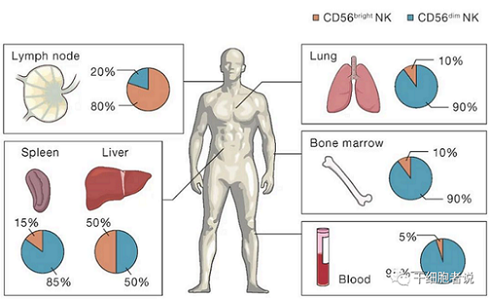 NK細(xì)胞主要存在于淋巴結(jié)、骨髓、外周血、肺、脾臟、肝臟等器官內(nèi);CD56的表達(dá)可以分兩個(gè)NK細(xì)胞亞群,CD56dim和CD56bright,其中CD56- NK細(xì)胞具有抗腫瘤細(xì)胞毒性,并且兩個(gè)亞群都能夠產(chǎn)生細(xì)胞因子。[圖3]。